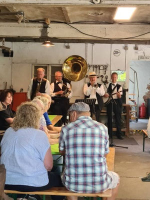 Die Musiker – Bandleader Michael Weiß (Trompete, Gesang, Moderation), Helmar Markcinski (Saxophon, Klarinette), Wolfgang Dörner (Banjo) und Hans-Henning Möller (Sousaphon) – überzeugten durch Spielfreude, musikalische Präzision und ein feines Gespür für das richtige Maß an Schwung und Zurückhaltung. Die Band verstand es hervorragend, das historische Ambiente der Schmiede mit feinen Jazzklängen zu füllen und dabei stets eine angenehme Lautstärke und Atmosphäre zu wahren.